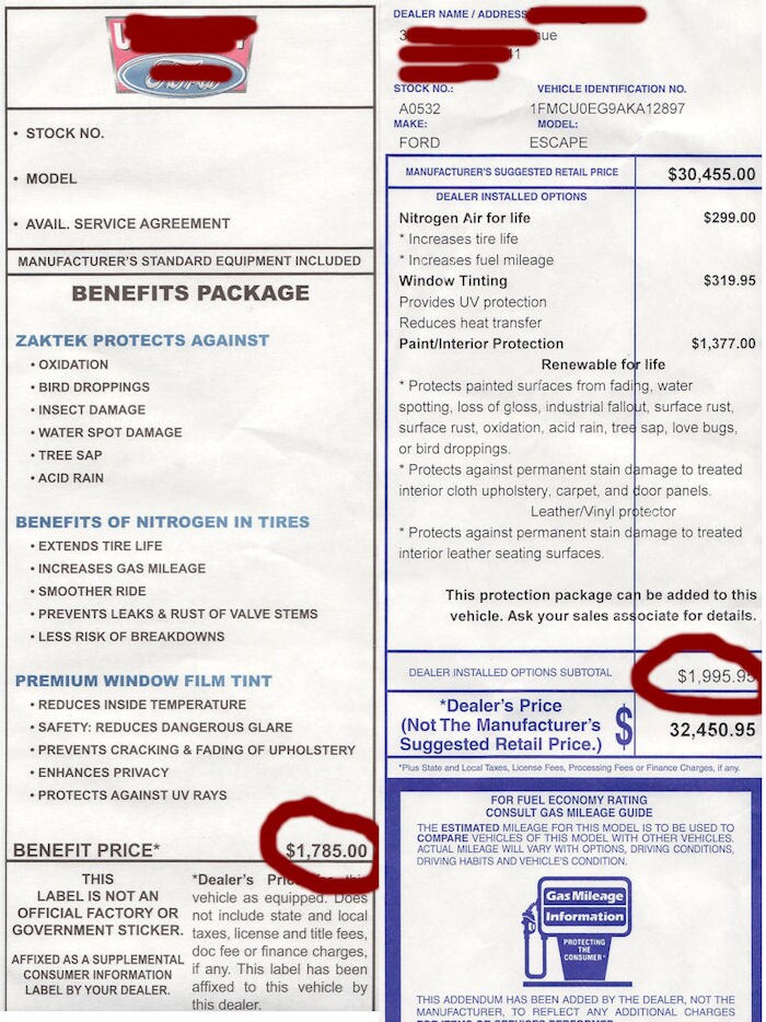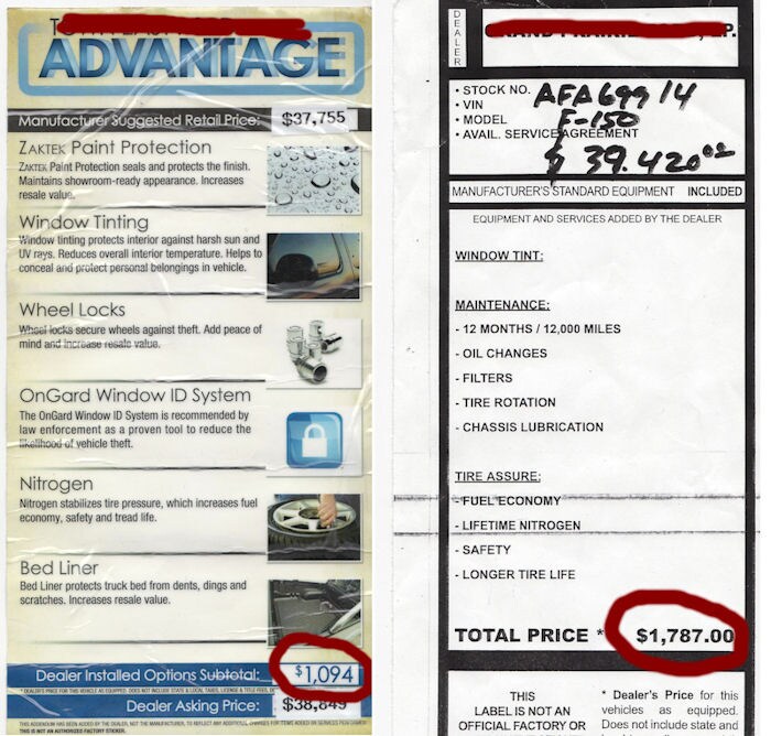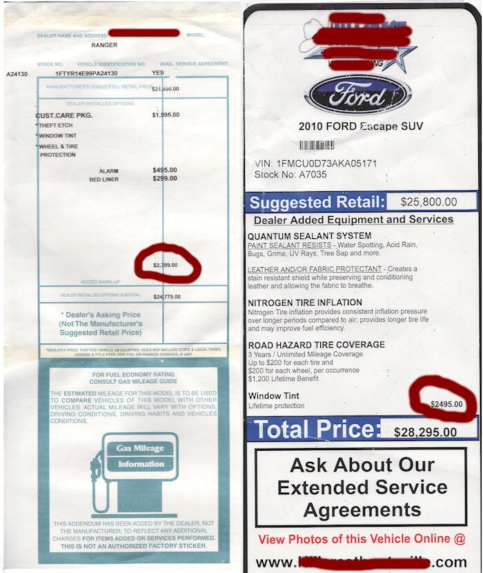 Below are some real examples of misleading dealer added fees taken from the windows of real cars at other dealers in the Dallas area. The names of the offending dealerships are marked out.